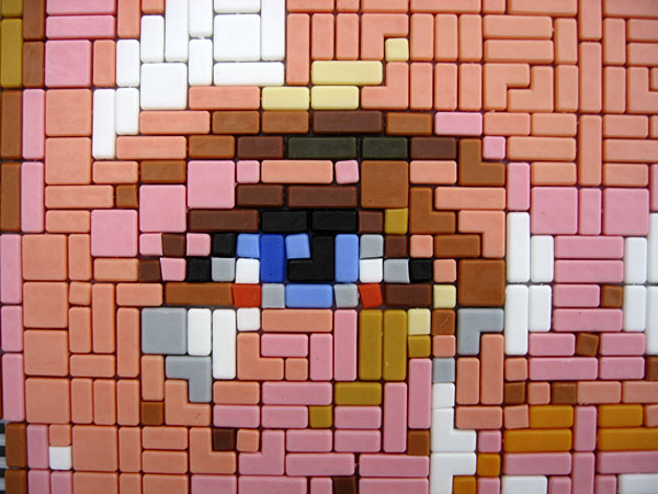 ![]() Zwei Wochen Arbeit und immer noch nicht fertig: die ministeck-Interpretation einer 67 x 93 Pixel großen Computergrafik Die Stärke von ministeck ist seine Sinnlosigkeit. Jeder weiß, dass man Mosaike am Computerbildschirm bedeutend schneller und effektiver Zusammenbauen kann als mit der bloßen Hand: das Spiegeln, Kopieren und Verschieben ganzer Mosaik-Cluster bringt einen rasch zum Ziel – beim Ministecken sorgt es für ausgeleierte Fingernägel. Doch ministeck macht nicht willenlos, wie der Aufmerksamkeitsräuber Computer. Man kann gemeinsam mosaiken, sich unterhalten, das Gehirn abschalten, aufhören und wieder anfangen. Eine wunderbarer Ausgleichssport für digital geschädigte Hirne. ![]() Detailansicht: ein Standard-ministeck-Sortiment enthält nur 4 Single Bits, so dass man sich eine Menge davon selbst zurecht schneiden muss. Herausgegeben: Fr - November 4, 2005 at 10:20 vorm. | |